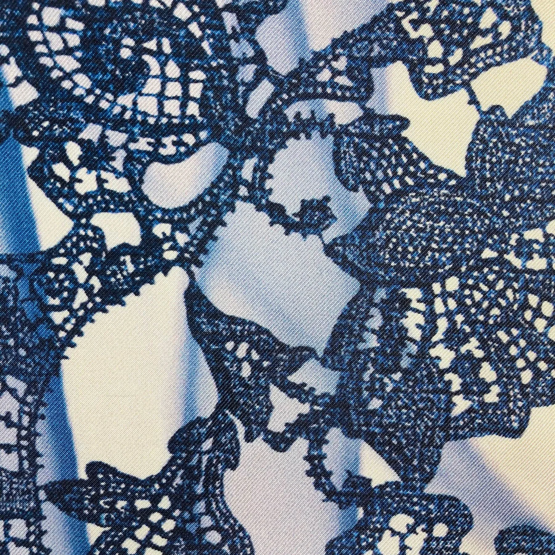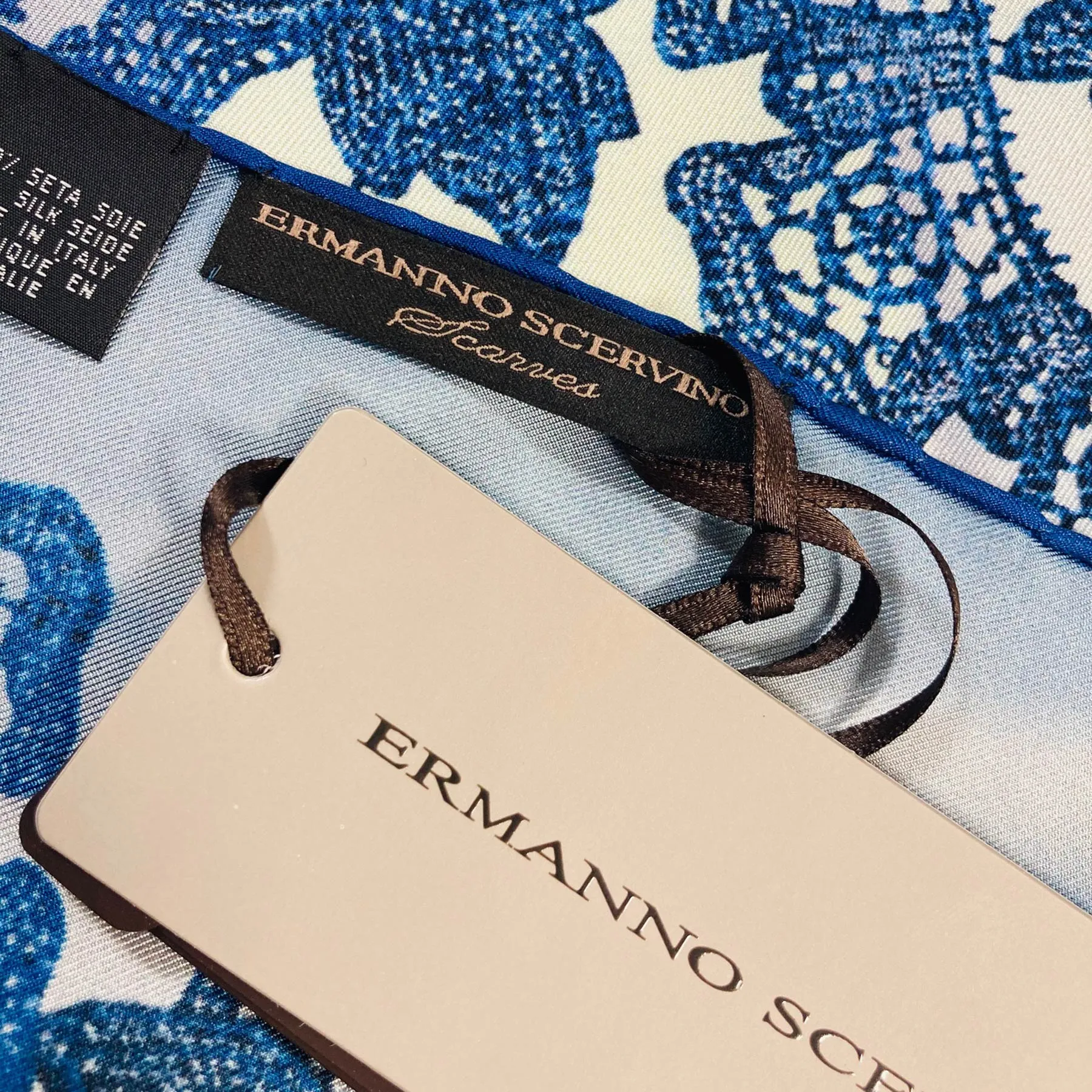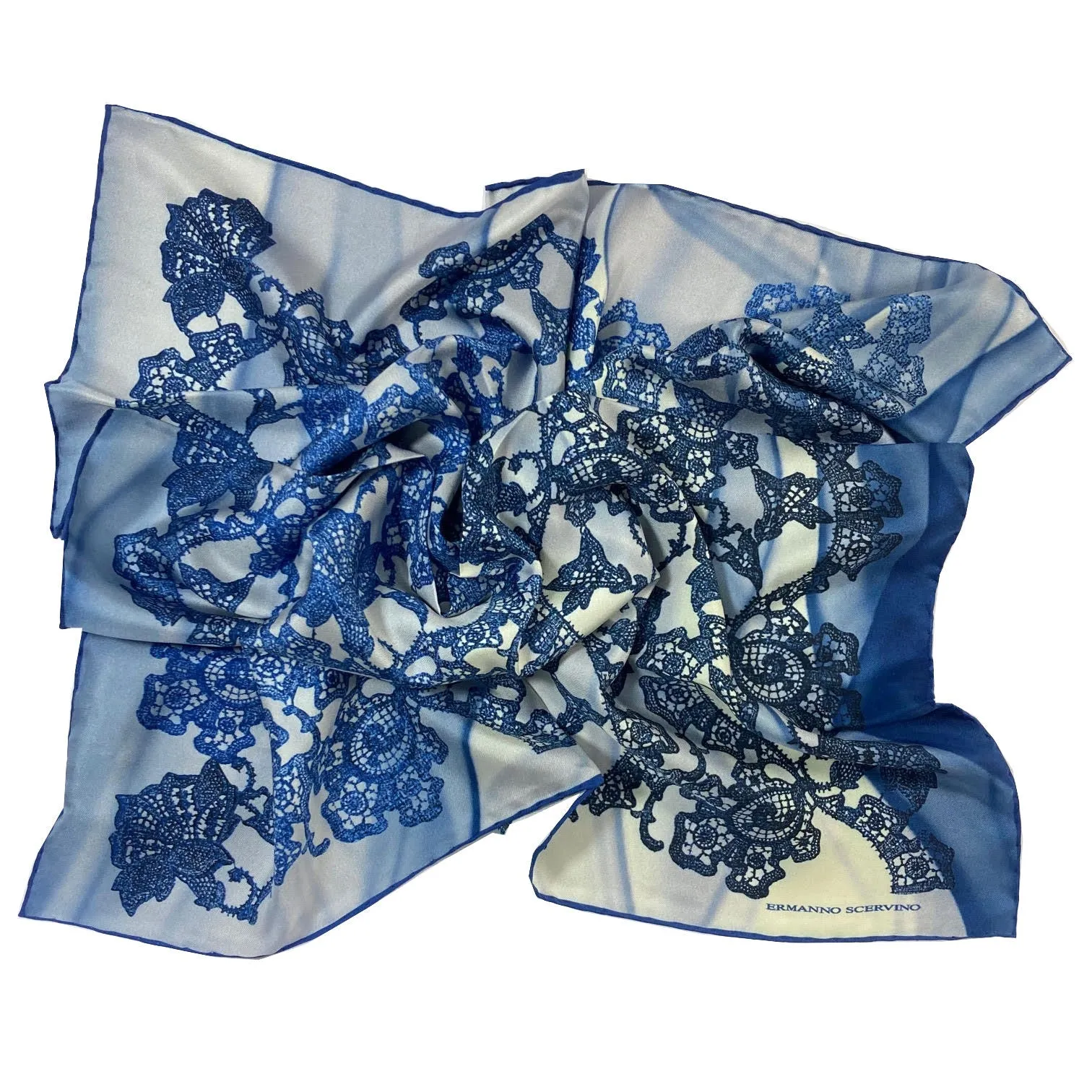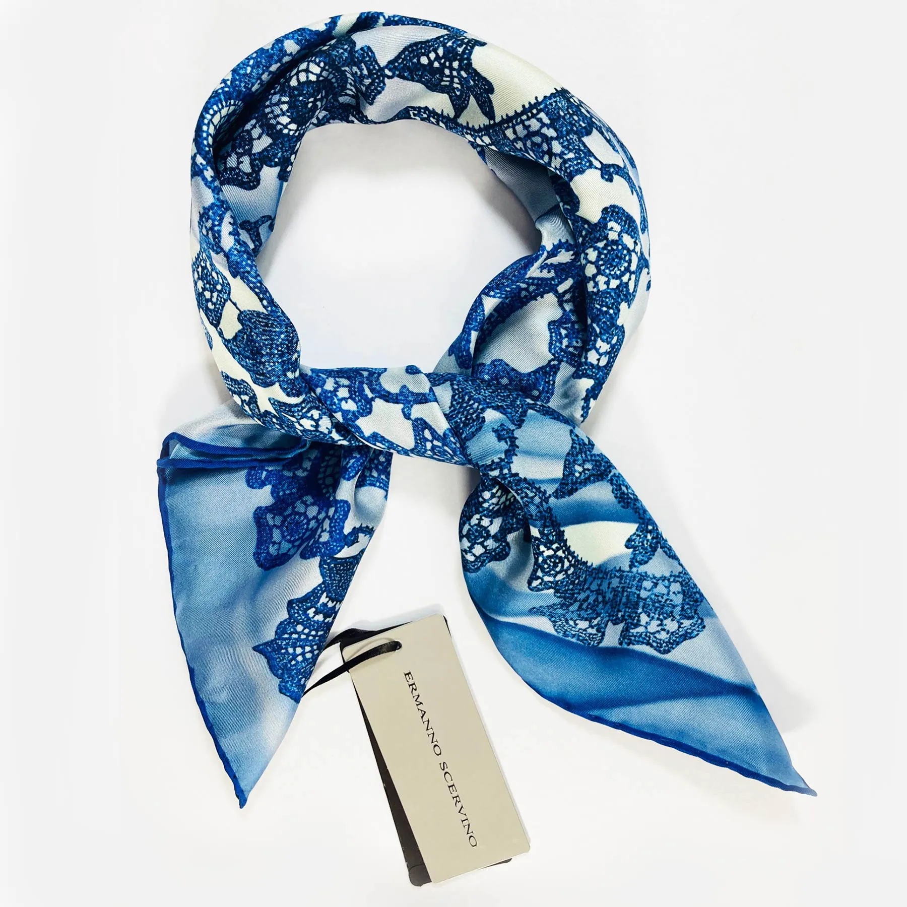Authentic Ermanno Scervino scarf, shades of blue-gray ornamental design, twill silk, made in Italy. Genuine Ermanno Scervino silk scarves, shop at outlet prices.